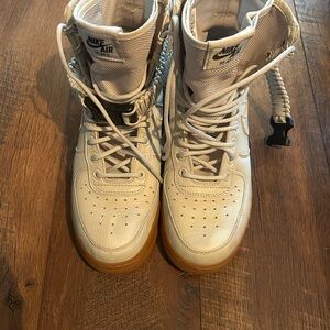 Stylish high-top sneakers. Features a unique strap design. Comfortable and trendy.