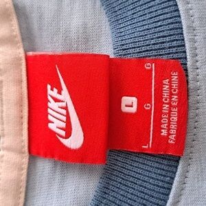 Nike Air Force 1 swoosh spellout graphic ringer blue gray casual LG t-shirt is in good shape with normal wear. Good wash wear and minimal fade.
