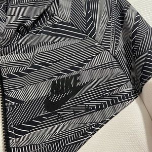 Nike Active zip up jacket windbreaker with hood XS. Fits more like a Small/Medium. Black and white with mild discoloration at the wrists as pictured. This could be brightened up with additional cleaner. All zippers work pockets on the outside and inside. Visor hood. Black material is windbreaker material whereas the white is textured cloth.