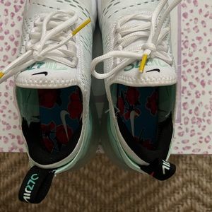 Stylish Nike athletic shoes. White mesh with mint accents. Red detailing for a pop of color. Comfortable and trendy.