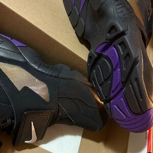 Stylish Nike sneakers featuring a bold black and white design with striking purple accents. Perfect for both sports and casual wear.