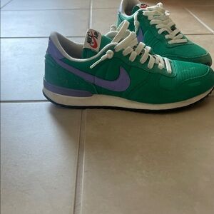 Step out in style with these classic Nike Air sneakers. Featuring a bold emerald green upper with breathable mesh and suede overlays, accented by a lavender purple Nike swoosh and heel tab, these shoes combine retro vibes with everyday comfort. The cushioned midsole and durable rubber outsole provide all-day support, making them perfect for casual wear or street style looks.