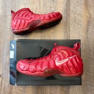 Nike Air Foamposite Pro Gym Red October Size 11 Sneakers Shoes w/ Box 624041-603. Used with slight separation and signs of wear. As can be seen, one shoe is missing the swoosh. Still plenty of life left. Come with the original (partially flawed) box. Sick pair of kicks!