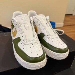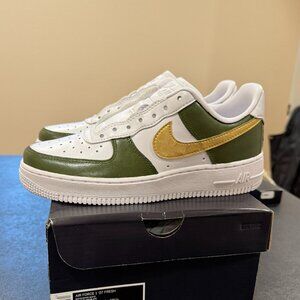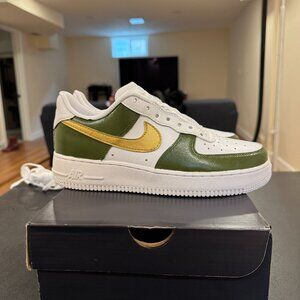 Custom hand painted Air Force 1's! Painted with high end acrylic paint in a shoe painting studio. Paint colors are army green and gold. Shoes come with 2 pairs of white laces, 1 pair of camo laces, and 4 gold aglets to fix to the ends of the laces. Shoes have been sprayed to seal in the paint and prevent water damage.