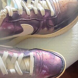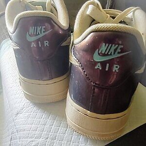 Nike Air Force 1 men's athletic shoes show captivating iridescent Iced Lilic showcasing color-shifting effect on upper shoes.