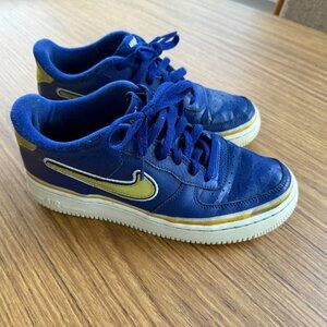 Nike Kid’s Air Force 1 LV8 Sport sneakers in Deep Royal Blue and University Gold. Youth size 7. Preloved condition with plenty of wear left.