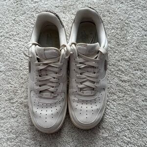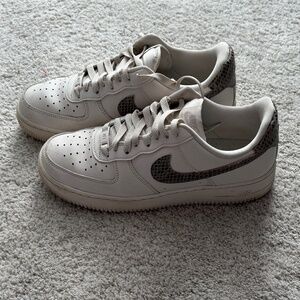 Elevate your sneaker game with these Nike Air Force 1 ’07s, featuring a luxe twist on a streetwear classic. This women’s size 9 pair comes in a clean Phantom (off-white) base with a bold snakeskin-textured Light Iron Ore Swoosh, offering an effortlessly cool look that stands out from the crowd.