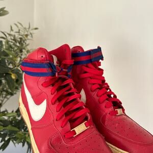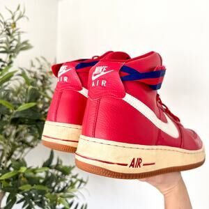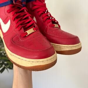 Details: Nike Air Force 1 2015 High 07 Lace-Up Sneakers - Size: 9.5- Color: Gym Red- Material: - Features: High top, lace-up, round toe, logo, ankle-strap, rubber outsole, comfort, casual.