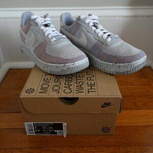 Nice pair of Air Force 1 Crater FlyKnit sneakers in “Wolf Grey/Pure Platinum/Gym Red/White” colorway. Inside size tag states men’s 8.0, equivalent to women’s 9.5. Includes the original box.