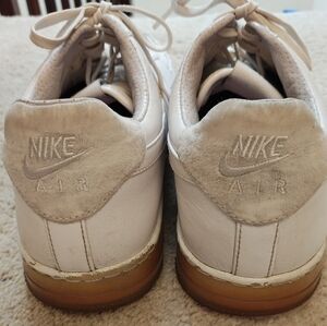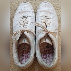 Nike Air Force 1 Downtown NRG "White Gum" sneakers, specifically the 30th Anniversary Edition. Size 11. Great condition. These shoes are a premium, slimmer version of the classic Air Force 1, known for their clean all-white leather upper and a distinct gum sole. They feature "XXX" lace tags, commemorating the 30th anniversary of the Air Force 1 line. #sneakers #nike #airforce1
