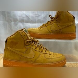 The Nike Air Force 1 High '07 LV8 Men's WB 'Flax' is a shoe that is part of Nike's Wheat Collection. It has a Flax nubuck upper with tonal laces, no ankle straps, and branding. The shoe also has a gum rubber outsole.