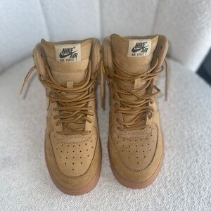 Classic Nike Air Force 1 high tops. Rich brown color. Ideal for everyday style.