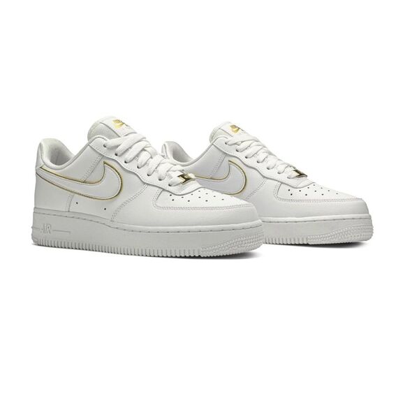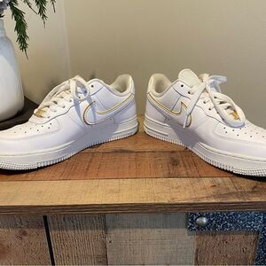 Women’s AF1 07 ESS Metallic Gold released in 2019. Size 7. Premium leather that features a double swoosh accented in gold as well as gold accents on the tongue , dubrae and heel. One of four shoes released in the series. Worn twice in excellent condition.