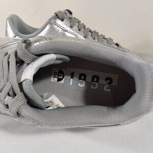 The Nike Air Force 1 Dream Team sneaker takes its name from the historic Barcelona Dream Team during their basketball games at the 1992 Olympics. Silver colorway. Perforated leather. 1992 on the insole. Basketball and five stars at the heel. LV8 sole is an elevated version of the original shoe, characterized by a thicker, stacked sole that adds height and a more substantial, platform-like feel.