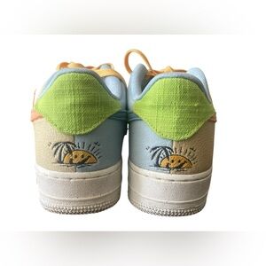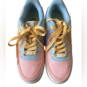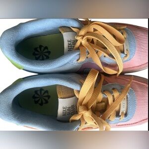 Nike sneakers featuring a blend of pink, orange, yellow, and blue. Stylish and vibrant design.