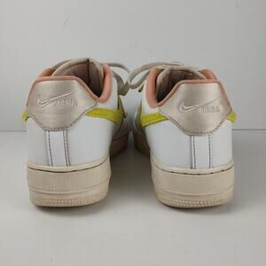 White/pink/yellow Nike Air Forces, women's size 8. They're in great condition with no holes or stains, though the midsoles are slightly oxidized.