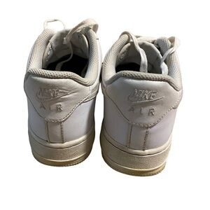 Elevate your athletic style with these Nike Air Force 1 Low sneakers in Triple White. Designed for women's size 8, these lace-up sneakers feature a solid pattern with subtle Nike logo accents. The leather upper material and foam insole provide ultimate comfort and durability for gym training or walking. These are in decent shape! There is some wear on the back of the shoes but they still look great! Check out all of the pics for the details!!!