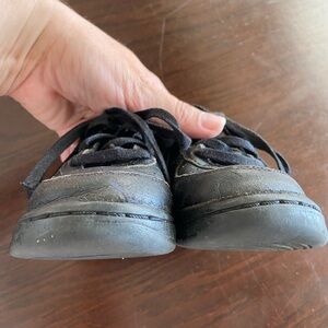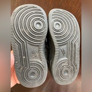 Nike Air Force 1 Low Triple Black sneakers. Stylish and comfortable, these Nike toddler kids sneakers are perfect for everyday wear. The sleek black design adds a touch of cool to any outfit. Size 8C. These are older and have been worn. The rubber on the front of one toe pulls down just a bit when you pull it from being caught on the floor.