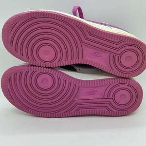 Nike Air Force 1 Low 'Cool Rose' sneakers in youth size 4.5Y. These iconic shoes feature a vibrant combination of white leather, shimmery purple accents, and cool rose pink details on the swoosh, laces, and sole. The design includes perforated toe boxes for breathability and classic Air Force 1 styling. Perfect for adding a pop of color and sparkle to any youth's footwear collection.