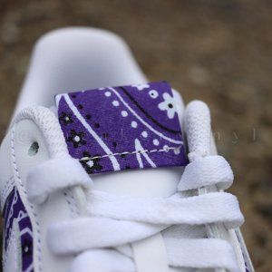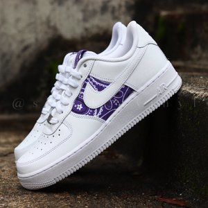 Nike Air Force 1 Low Grape Bandana Custom NWT. These shoes are made to order. Please allow at least 5-7 days for shipping. These customs are made with a purple bandana, these customs have a hand made and hand stitched tongue tags. You can also check these shoes out at www.sneakervinyl.com