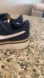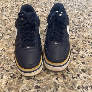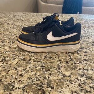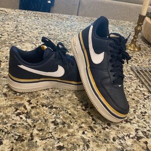 Nike Air Force 1 Low 'Obsidian' sneakers with gold ribbon detailing around the midsole. These sneakers feature an obsidian smooth leather upper, a white tumbled leather Swoosh logo, and a white midsole with gold and obsidian ribbon accents. The outsole is also white, and the word "AIR" is visible on the side of the heel. Open to offers and bundle items to save!