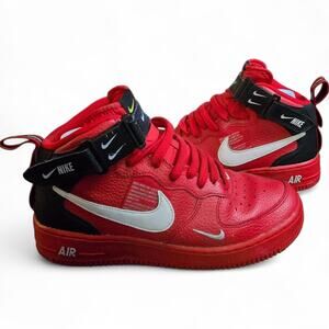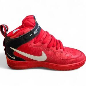 Up for sale is a pair of Nike Air Force 1 Mid LV8 (GS) sneakers, style code AV3803-600 in a bold red, black, and white colorway. These shoes are youth size 6.5Y, which is equivalent to a women’s size 8. This model features striking Nike branding, premium materials, and a secure mid-top design with adjustable strap.