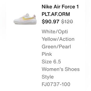 Nike Air Force 1 PLT.AF.ORM 6.5 W white / yellow / green and pink. Purchased as indicated in last pic for $90 on sale. Have been worn and wear and tear is as pictured.
