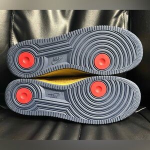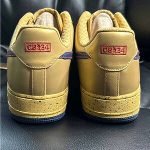 The Nike Air Force 1 Premium Low Barkley Pack in Size 10.5 features a stylish design with a low top shaft style and a sleek sneaker style. This athletic shoe is part of the Nike Air Force product line and showcases a classic color combination of gold with navy and red accents. With the iconic Nike branding and quality construction, this shoe is a must-have for sneaker enthusiasts looking for a fashionable and comfortable option. Shoes and box in great condition. Shoes never worn.