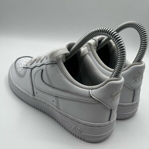 These Nike sneakers feature a sleek all-white leather upper with a perforated toe box and signature swoosh logo. The thick white midsole and padded collar offer comfort and support, making them a versatile choice for any outfit.