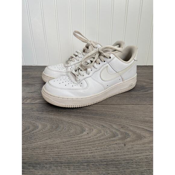The product is a pair of Nike Air Force 1 White Low Top Women's Size 9 Classic AF1 Sneakers, featuring a lace-up closure, rubber outsole, and cushioned insole for comfort and breathability. These sneakers are designed for both activewear and casual occasions, with a low-top style and solid white color. The Nike Air Force 1 model, released in 2020, is a sporty and retro-inspired shoe with a standard shoe width and leather upper material. Perfect for walking, school, or everyday wear, these sneakers combine classic style with modern features for a versatile and stylish addition to any wardrobe.