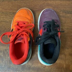 Fun and vibrant mismatched Nike sneakers for kids. Features one black and purple shoe and one orange shoe. Perfect for a playful look.
