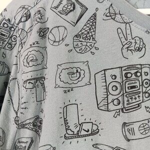 Men's Nike Air graphic tee with a fun design, showcasing various doodles. The iconic Nike Air logo in bold coral adds a pop of color.