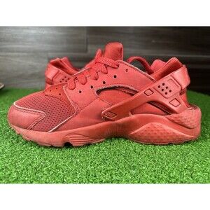Elevate your little one's style with these Nike Air Huarache Sneakers in size 5.5 Y. The round toe and low-top shoe shaft design offer both comfort and flexibility, making them perfect for travel, casual wear, and sports activities. These sneakers feature a lace-up closure, synthetic upper material, and a solid pattern with accents of red and Nike logo detailing.