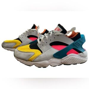 Vibrant Nike sneakers with a mix of colors. Features include a bold design with teal, yellow, pink, and black accents.
