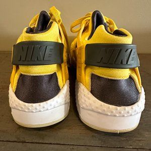 Nike Air Huarache Run Tour Yellow and Navy. In good used condition. They are clean and not a lot of wear on the tread. The only flaw is the inside of the left shoe has a little blue spot of discoloration on the leather and the rubber.