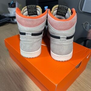 Stylish Nike Air Jordan 1 High OG. Features black and gray suede with vibrant orange accents. Iconic design with classic branding. Air Jordan 1 Retro High OG “Neutral Grey/Hyper Crimson” (a.k.a. “Crimson Tint” or “Neutral Grey Hyper Crimson”) from the SP19 collection.
