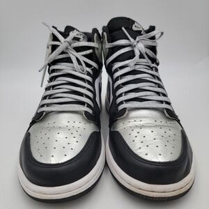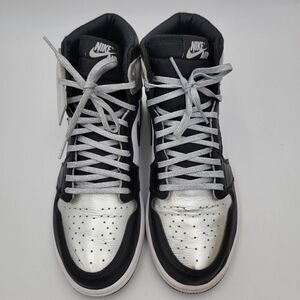 Elevate your sneaker game with these Nike Air Jordan 1 High OG Metallic Silver sneakers. These satin sneakers feature a sleek colorblock pattern in black and silver with a bold Nike logo accent. With a lace-up closure and adjustable strap, these shoes provide a comfortable and supportive fit for any occasion, whether it be activewear or casual wear.