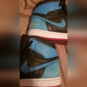 Nike Air Jordan 1 High OG UNC to Chicago Sneakers. Women Size 9.5. Boys Size 7.5. These shoes were released in 2020 and celebrate Michael Jordan's Basketball careers at University of North Carolina and Chicago Bulls by combining familiar tones related to each team in a bold color way pattern of the red for Chicago and blue for North Carolina. These shoes are in used condition and has some fading on the blue leather of both heels as pictured but otherwise great condition!
