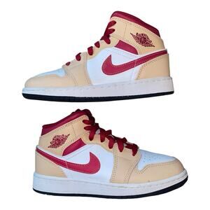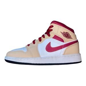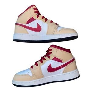 Nike Air Jordan 1 Mid Beige Red Onyx Light Curry Sneakers 554725-201 GS 3.5Y
