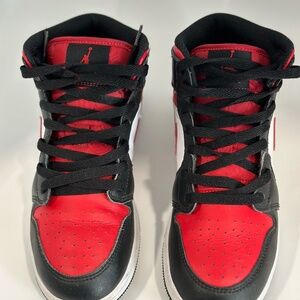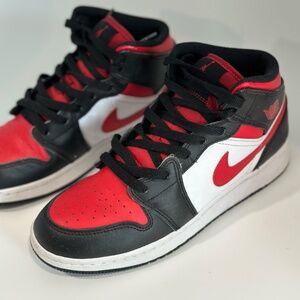 Step into bold style with these Nike Air Jordan 1 Mids in the iconic Bred Toe colorway (White / Black / Fire Red). Size US 5.5Y — great for teens or smaller feet. These come from a smoke-free, pet-free home and are in good condition.