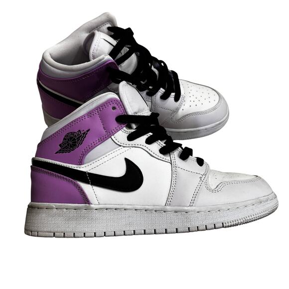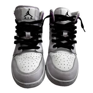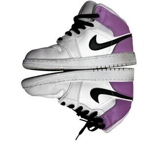 Nike Air Jordan 1 Mid Sneakers with the classic mid-top silhouette. Purple and white color with iconic swoosh and Air Jordan Wings. Good pre-owned condition. Light creasing on leather and minor sole wear consistent with normal use. Youth Size 5Y equivalent to approx Womens 6.5. No box included.