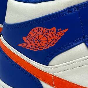 Step out in style with these eye-catching Nike Air Jordan 1 Mid 'Knicks' sneakers. Featuring a vibrant Game Royal blue and Rush Orange colorway with crisp white accents, these mid-top sneakers perfectly capture the iconic New York Knicks team colors. Made from durable leather with perforated toe boxes for breathability and signature Air-Sole unit for cushioning, they provide both comfort and classic hoops style.
