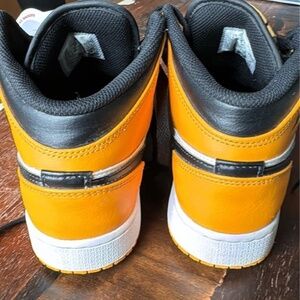Nike Air Jordan 1 Mid "Reverse Yellow Toe" Taxi (554724-701) shoes, white black yellow size 5Y. EUC, wear noted in pictures.
