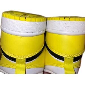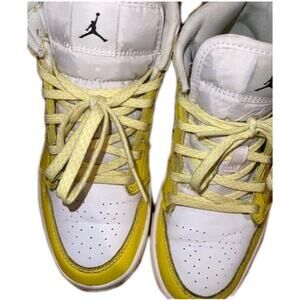 The product is a pair of Nike Air Jordan 1 Mid SE GS Floral Rose Yellow sneakers in size 3Y. These athletic sneakers designed by Jordan feature a floral pattern with a yellow color scheme, perfect for unisex kids. The leather upper material and Nike Air product line ensure a stylish and comfortable fit for young sneaker enthusiasts. The rose theme adds a touch of femininity to the classic Air Jordan 1 Mid SE model.