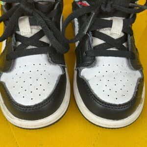 Experience the timeless appeal of Nike's black and white sneakers, featuring a high-top silhouette and the iconic swoosh logo. These sneakers combine classic style with modern comfort, showcasing a clean white midsole and traditional lacing system. Perfect for those who appreciate a blend of heritage and contemporary design in their footwear shoes are in good condition.