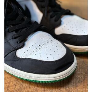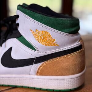 These shoes are in great pre-loved condition! No rips or tears. There is minor wear as to be expected with used shoes as seen in photos. These are gorgeous Air Jordans with a green and gold colorway. These will also need new insoles. There is also some creasing as seen in photos, but overall they are in great condition. Men's size 13!