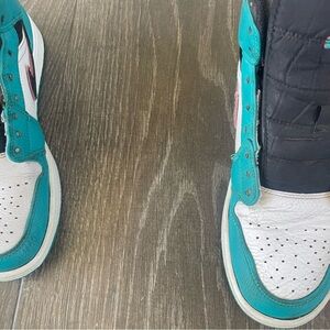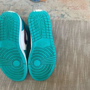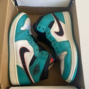 Jordan 1 “South Beach.” Teal, pink and black Nike Air Jordan sneakers. Features classic swoosh and wing logo. Shoes are used but still pretty clean with plenty of life left in them. Please note the creases, scuff marks, and worn soles. Originally box included.