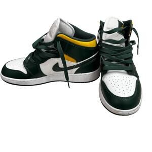 Overall good condition with light wear. Classic Jordan 1 Mids in the color green, white, and yellow with lace up closure. Iconic Nike Swoosh and Jumpman branding.