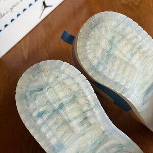 Nike Air Jordan 1 Mid "Sneaker School" retro style shoes in toddler size 8. Darling muted pastel colors are called Aegean Storm/Pink Oxford/Red Stardust/Hemp. Includes the original box, which has some shelf wear. VGUC; very slight wear on the soles, slight wear at the toes, minor discoloration on some areas like the top edges and the laces. Signs of light use when you look closely, but no damage or significant wear.