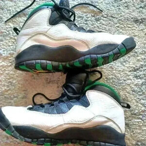 Small scratching on the leather but shown in photos. Comes from a smoke free home. Dressed in a White, Black, Kelly Green, and Yellow Gold color scheme. This Air Jordan 10 features a classic White upper with Black detailing and the iconic Green and Gold accents uniquely inspired by the Seattle squad.
